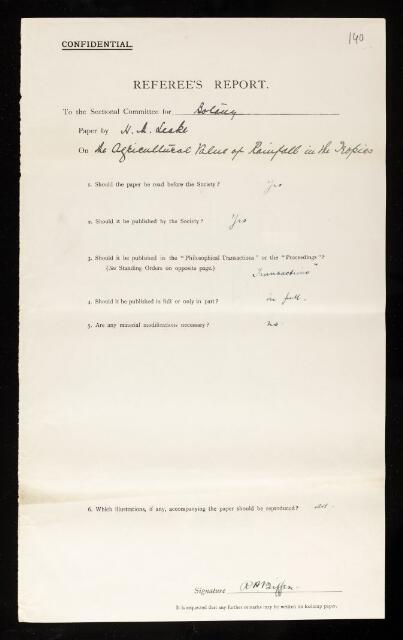 Referee's report by William Napier Shaw, on a paper 'The agricultural value of rainfall in the tropics' by H Martin Leake