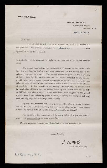 Referees' reports on scientific papers submitted to the Royal Society for publication
