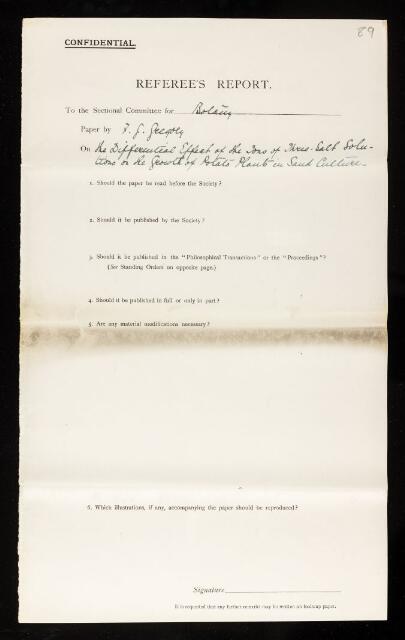 Harold William Taylor Wager, Referee's report by Harold William Taylor Wager, on a paper 'The differential effect of the ions of three-salt solutions on the growth of potato plants sand culture' by F G Gregory, June 1927, RR/35/89, The Royal Society Archives, London, https://makingscience.royalsociety.org/items/rr_35_89/referees-report-by-harold-william-taylor-wager-on-a-paper-the-differential-effect-of-the-ions-of-three-salt-solutions-on-the-growth-of-potato-plants-sand-culture-by-f-g-gregory, accessed on 08 December 2025