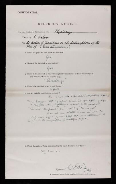 Marcus Seymour Pembrey, Referee's report by Marcus Seymour Pembrey, on a paper 'The action of guanidins on the melanophores of the skin of the frog (Rana temporaria)' by Severo Ochoa, October 1927, RR/36/22, The Royal Society Archives, London, https://makingscience.royalsociety.org/items/rr_36_22/referees-report-by-marcus-seymour-pembrey-on-a-paper-the-action-of-guanidins-on-the-melanophores-of-the-skin-of-the-frog-rana-temporaria-by-severo-ochoa, accessed on 24 January 2026