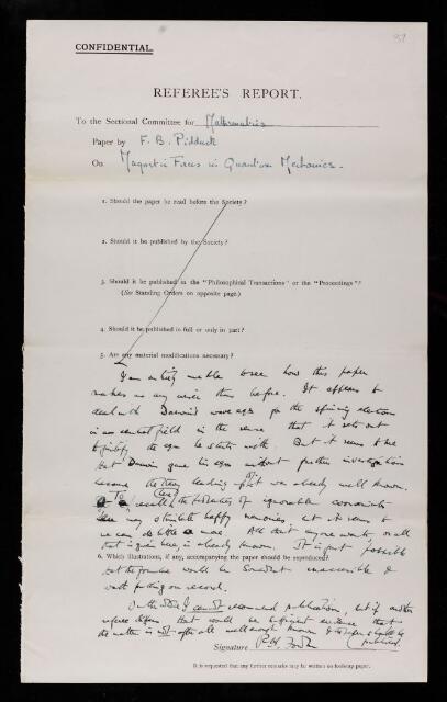 Ralph Howard Fowler, Referee's report by Ralph Howard Fowler, on a paper 'Magnetic forces in quantum mechanics' by F B Pidduck, November 1927, RR/36/37, The Royal Society Archives, London, https://makingscience.royalsociety.org/items/rr_36_37/referees-report-by-ralph-howard-fowler-on-a-paper-magnetic-forces-in-quantum-mechanics-by-f-b-pidduck, accessed on 07 November 2025