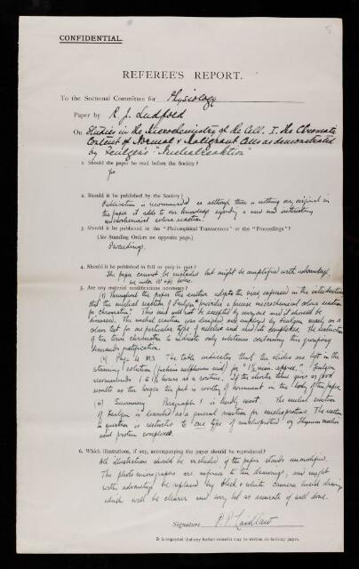 Patrick Playfair Laidlaw, Referee's report by Patrick Playfair Laidlaw, on a paper 'Studies in the microchemistry of the cell. I.—The chromatin content of normal and malignant cells, as demonstrated by Feulgen's “Nuclealreaktion."' by Reginald James Ludford, December 1927, RR/36/5, The Royal Society Archives, London, https://makingscience.royalsociety.org/items/rr_36_5/referees-report-by-patrick-playfair-laidlaw-on-a-paper-studies-in-the-microchemistry-of-the-cell-ithe-chromatin-content-of-normal-and-malignant-cells-as-demonstrated-by-feulgens-nuclealreaktion-by-reginald-james-ludford, accessed on 16 March 2026