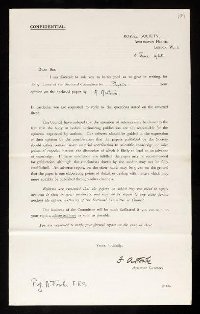 Alfred Fowler, Referee's report by Alfred Fowler, on a paper 'The absorption spectrum of caesium' by Irene Maud Mathews, 08 June 1928, RR/37/104, The Royal Society Archives, London, https://makingscience.royalsociety.org/items/rr_37_104/referees-report-by-alfred-fowler-on-a-paper-the-absorption-spectrum-of-caesium-by-irene-maud-mathews, accessed on 10 April 2026