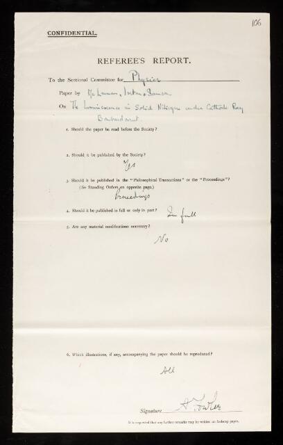 Alfred Fowler, Referee's report by Alfred Fowler, on a paper 'On the luminescence of solid nitrogen under cathode ray bombardment' by John Cunningham McLennan, H J C Ireton and E W Samson, July 1928, RR/37/106, The Royal Society Archives, London, https://makingscience.royalsociety.org/items/rr_37_106/referees-report-by-alfred-fowler-on-a-paper-on-the-luminescence-of-solid-nitrogen-under-cathode-ray-bombardment-by-john-cunningham-mclennan-h-j-c-ireton-and-e-w-samson, accessed on 18 January 2026