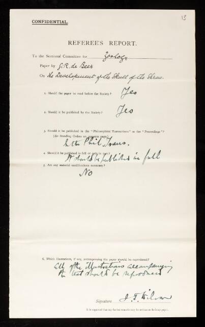James Thomas Wilson, Referee's report by James Thomas Wilson, on a paper 'The development of the skull of the shrew' by Gavin Rylands De Beer, December 1928, RR/37/13, The Royal Society Archives, London, https://makingscience.royalsociety.org/items/rr_37_13/referees-report-by-james-thomas-wilson-on-a-paper-the-development-of-the-skull-of-the-shrew-by-gavin-rylands-de-beer, accessed on 09 December 2025