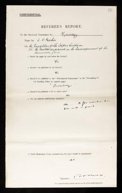 Francis Hugh Adam Marshall, Referee's report by Francis Hugh Adam Marshall, on a paper 'The functions of the corpus luteum.—III. The factors concerned in the development of the mammary gland' by Alan Sterling Parkes, October 1928, RR/37/131, The Royal Society Archives, London, https://makingscience.royalsociety.org/items/rr_37_131/referees-report-by-francis-hugh-adam-marshall-on-a-paper-the-functions-of-the-corpus-luteumiii-the-factors-concerned-in-the-development-of-the-mammary-gland-by-alan-sterling-parkes, accessed on 25 January 2026