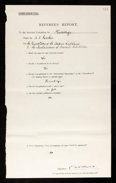 Francis Hugh Adam Marshall, Referee's report by Francis Hugh Adam Marshall, on a paper 'The functions of the corpus luteum.—I. The mechanism of œstrus inhibition' by Alan Sterling Parkes, October 1928, RR/37/132, The Royal Society Archives, London, https://makingscience.royalsociety.org/items/rr_37_132/referees-report-by-francis-hugh-adam-marshall-on-a-paper-the-functions-of-the-corpus-luteumi-the-mechanism-of-œstrus-inhibition-by-alan-sterling-parkes, accessed on 14 November 2025