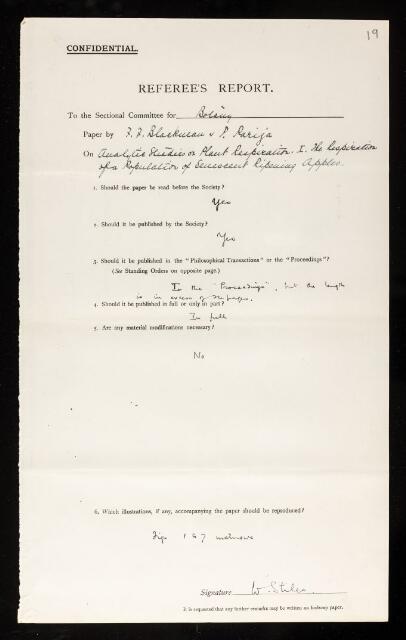 Walter Stiles, Referee's report by Walter Stiles, on a paper 'Analytic studies in plant respiration. I.—The respiration of a population of senescent ripening apples' by Frederick Frost Blackman and P Parija, July 1928, RR/37/19, The Royal Society Archives, London, https://makingscience.royalsociety.org/items/rr_37_19/referees-report-by-walter-stiles-on-a-paper-analytic-studies-in-plant-respiration-ithe-respiration-of-a-population-of-senescent-ripening-apples-by-frederick-frost-blackman-and-p-parija, accessed on 17 December 2025
