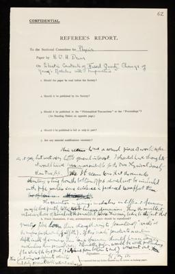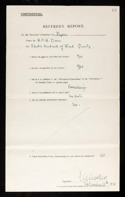Ernest George Coker, Referee's report by Ernest George Coker, on a paper 'Elastic constants of fused quartz. Change of young's modulus with temperature' by H D H Drane, 12 September 1928, RR/37/62, The Royal Society Archives, London, https://makingscience.royalsociety.org/items/rr_37_62/referees-report-by-ernest-george-coker-on-a-paper-elastic-constants-of-fused-quartz-change-of-youngs-modulus-with-temperature-by-h-d-h-drane, accessed on 21 January 2026