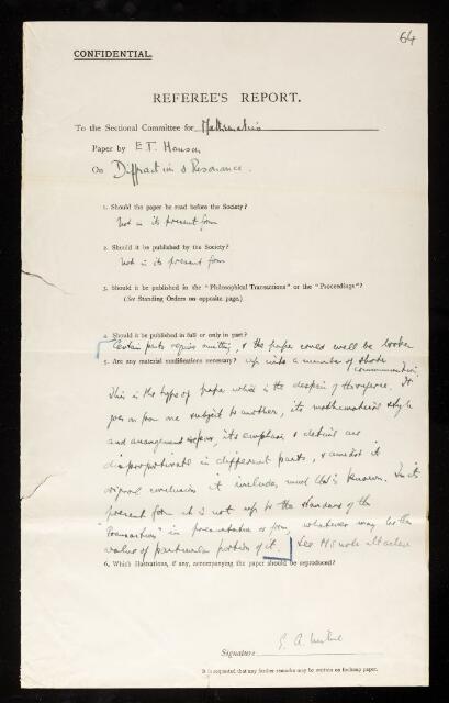 Edward Arthur Milne, Referee's report by Edward Arthur Milne, on a paper 'Diffraction and resonance' by E T Hanson, 1928, RR/37/64, The Royal Society Archives, London, https://makingscience.royalsociety.org/items/rr_37_64/referees-report-by-edward-arthur-milne-on-a-paper-diffraction-and-resonance-by-e-t-hanson, accessed on 12 November 2025
