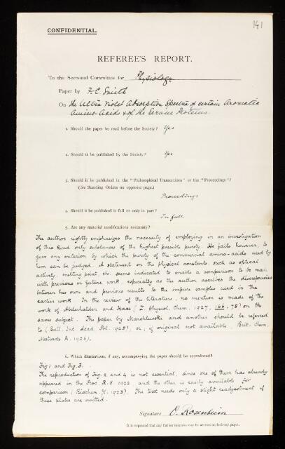 Otto Rosenheim, Referee's report by Otto Rosenheim, on a paper 'The ultra-violet absorption spectra of certain aromatic amino-acids, and of the serum proteins' by Frank Campbell Smith, 1 November 1928, RR/38/141, The Royal Society Archives, London, https://makingscience.royalsociety.org/items/rr_38_141/referees-report-by-otto-rosenheim-on-a-paper-the-ultra-violet-absorption-spectra-of-certain-aromatic-amino-acids-and-of-the-serum-proteins-by-frank-campbell-smith, accessed on 17 February 2026
