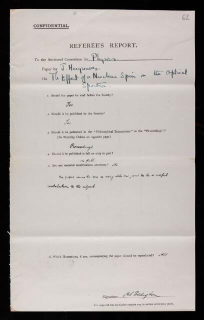 Arthur Stanley Eddington, Referee's report by Arthur Stanley Eddington, on a paper 'The effect of a nuclear spin on the optical spectra' by J Hargreaves, April 1929, RR/38/62, The Royal Society Archives, London, https://makingscience.royalsociety.org/items/rr_38_62/referees-report-by-arthur-stanley-eddington-on-a-paper-the-effect-of-a-nuclear-spin-on-the-optical-spectra-by-j-hargreaves, accessed on 10 November 2025