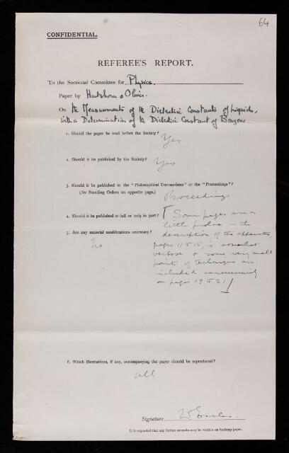 William Henry Eccles, Referee's report by William Henry Eccles, on a paper 'On the measurement of the dielectric constants of liquids, with a determination of the dielectric constant of benzene' by L Hartshorn and D A Oliver, February 1929, RR/38/64, The Royal Society Archives, London, https://makingscience.royalsociety.org/items/rr_38_64/referees-report-by-william-henry-eccles-on-a-paper-on-the-measurement-of-the-dielectric-constants-of-liquids-with-a-determination-of-the-dielectric-constant-of-benzene-by-l-hartshorn-and-d-a-oliver, accessed on 06 December 2025