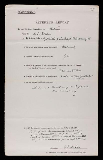 Frederick Ernest Weiss, Referee's report by Frederick Ernest Weiss, on a paper 'On the structures and affinities of Ankyropteris corrugata' by H S Holden, July 1929, RR/38/75, The Royal Society Archives, London, https://makingscience.royalsociety.org/items/rr_38_75/referees-report-by-frederick-ernest-weiss-on-a-paper-on-the-structures-and-affinities-of-ankyropteris-corrugata-by-h-s-holden, accessed on 19 January 2026