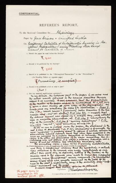 Thomas Graham Brown, Referee's report by Thomas Graham Brown, on a paper 'Reciprocal contraction of antagonistic muscles in peripheral preparations, using flashing neon-lamp circuit for excitation of nerve' by Grace Briscoe and Winifred Leyshon, June 1929, RR/39/33, The Royal Society Archives, London, https://makingscience.royalsociety.org/items/rr_39_33/referees-report-by-thomas-graham-brown-on-a-paper-reciprocal-contraction-of-antagonistic-muscles-in-peripheral-preparations-using-flashing-neon-lamp-circuit-for-excitation-of-nerve-by-grace-briscoe-and-winifred-leyshon, accessed on 07 November 2025