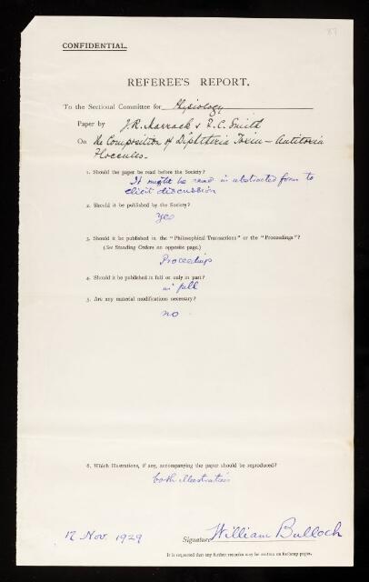 William Bulloch, Referee's report by William Bulloch, on a paper 'The composition of diphtheria toxin— Antitoxin floccules' by J R Marrack and Frank Campbell Smith, 17 November 1929, RR/39/87, The Royal Society Archives, London, https://makingscience.royalsociety.org/items/rr_39_87/referees-report-by-william-bulloch-on-a-paper-the-composition-of-diphtheria-toxin-antitoxin-floccules-by-j-r-marrack-and-frank-campbell-smith, accessed on 10 February 2026
