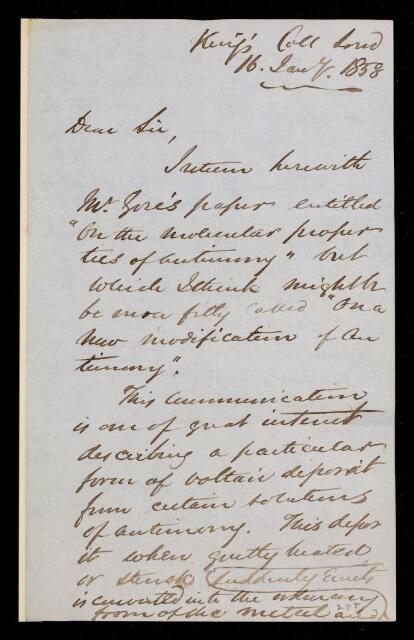 William Allen Miller, Referee's report by William Allen Miller, on a paper 'On the molecular properties of antimony' by George Gore, 16 July 1858, RR/3/121, The Royal Society Archives, London, https://makingscience.royalsociety.org/items/rr_3_121/referees-report-by-william-allen-miller-on-a-paper-on-the-molecular-properties-of-antimony-by-george-gore, accessed on 16 November 2025