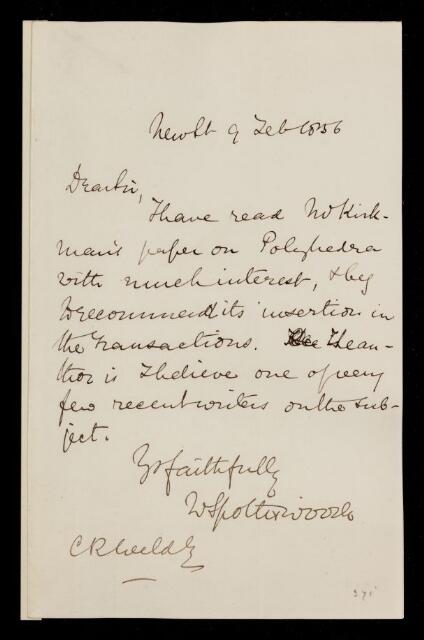 William Spottiswoode, Referee's report by William Spottiswoode, on a paper 'On the representation of polyedra' by Thomas Penyngton Kirkman, 09 February 1856, RR/3/165, The Royal Society Archives, London, https://makingscience.royalsociety.org/items/rr_3_165/referees-report-by-william-spottiswoode-on-a-paper-on-the-representation-of-polyedra-by-thomas-penyngton-kirkman, accessed on 10 November 2025