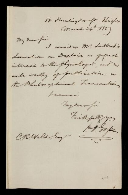 Philip Henry Gosse, Referee's report by Philip Henry Gosse, on a paper 'An account of the two methods of reproduction in Daphnia, and of the structure of the Ephippium' by John Lubbock, 24 March 1857, RR/3/182, The Royal Society Archives, London, https://makingscience.royalsociety.org/items/rr_3_182/referees-report-by-philip-henry-gosse-on-a-paper-an-account-of-the-two-methods-of-reproduction-in-daphnia-and-of-the-structure-of-the-ephippium-by-john-lubbock, accessed on 15 March 2026
