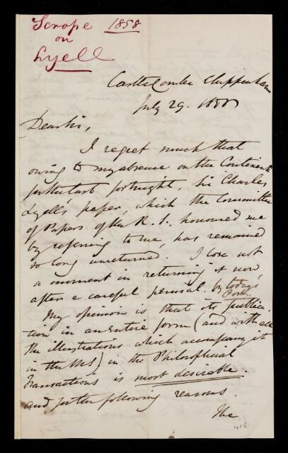 George Julius Poulett Scrope, Referee's report by George Julius Poulett Scrope, on a paper 'On the formation of continuous tabular masses of stony lava on steep slopes; with remarks on the mode of origin of Mount Etna, and the theory of craters of elevation' by Charles Lyell, 29 July 1858, RR/3/184, The Royal Society Archives, London, https://makingscience.royalsociety.org/items/rr_3_184/referees-report-by-george-julius-poulett-scrope-on-a-paper-on-the-formation-of-continuous-tabular-masses-of-stony-lava-on-steep-slopes-with-remarks-on-the-mode-of-origin-of-mount-etna-and-the-theory-of-craters-of-elevation-by-charles-lyell, accessed on 25 January 2026