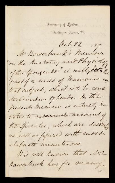 Letter from George Busk, on a paper 'On the anatomy and physiology of the spongiadae' by John Stuart Bowerbank