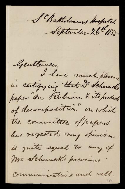 John Stenhouse, Referee's report by John Stenhouse, on a paper 'On rubian and its products of decomposition. Part III' by Edward Schunck, 26 September 1855, RR/3/248, The Royal Society Archives, London, https://makingscience.royalsociety.org/items/rr_3_248/referees-report-by-john-stenhouse-on-a-paper-on-rubian-and-its-products-of-decomposition-part-iii-by-edward-schunck, accessed on 09 March 2026
