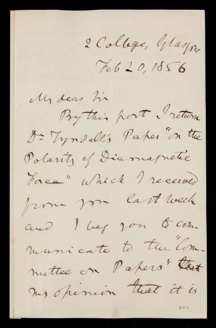 William Thomson, Referee's report by William Thomson, Lord Kelvin on a paper 'Further researches on the polarity of the diamagnetic force' by John Tyndall, 20 February 1856, RR/3/266, The Royal Society Archives, London, https://makingscience.royalsociety.org/items/rr_3_266/referees-report-by-william-thomson-lord-kelvin-on-a-paper-further-researches-on-the-polarity-of-the-diamagnetic-force-by-john-tyndall, accessed on 06 March 2026