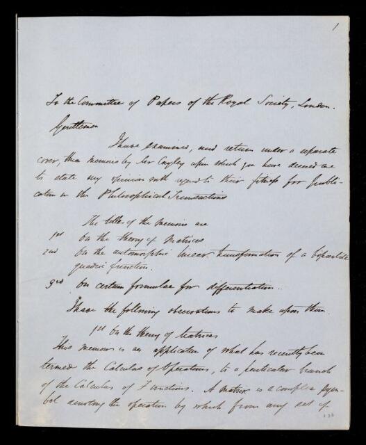 George Boole, Referee's report by George Boole, on three papers 'A memoir on the theory of matrices'; 'A memoir on the automorphic linar transformation of a bipartite quadric function'; 'On certain formulae for differentiation' by Arthur Cayley, 29 March 1858, RR/3/55, The Royal Society Archives, London, https://makingscience.royalsociety.org/items/rr_3_55/referees-report-by-george-boole-on-three-papers-a-memoir-on-the-theory-of-matrices-a-memoir-on-the-automorphic-linar-transformation-of-a-bipartite-quadric-function-on-certain-formulae-for-differentiation-by-arthur-cayley, accessed on 08 February 2026