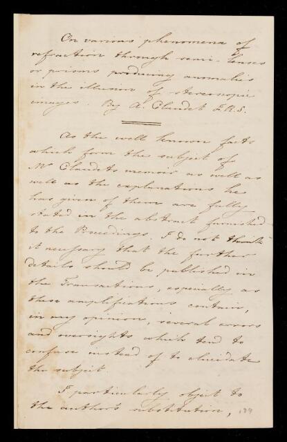 Referee's report by Charles Wheatstone, on a paper 'On various phenomena of refraction through semi-lenses or prisms, producing anomalies in the illusion of stereoscopic images' by Antoine Jean Francois Claudet