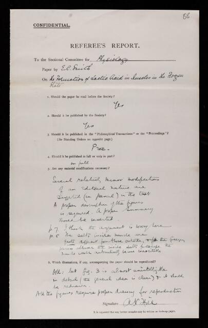 Archibald Vivian Hill, Referee's report by Archibald Vivian Hill, on a paper 'The formation of lactic acid in the muscles in the frozen state' by E C Smith, 1929, RR/40/88, The Royal Society Archives, London, https://makingscience.royalsociety.org/items/rr_40_88/referees-report-by-archibald-vivian-hill-on-a-paper-the-formation-of-lactic-acid-in-the-muscles-in-the-frozen-state-by-e-c-smith, accessed on 06 December 2025