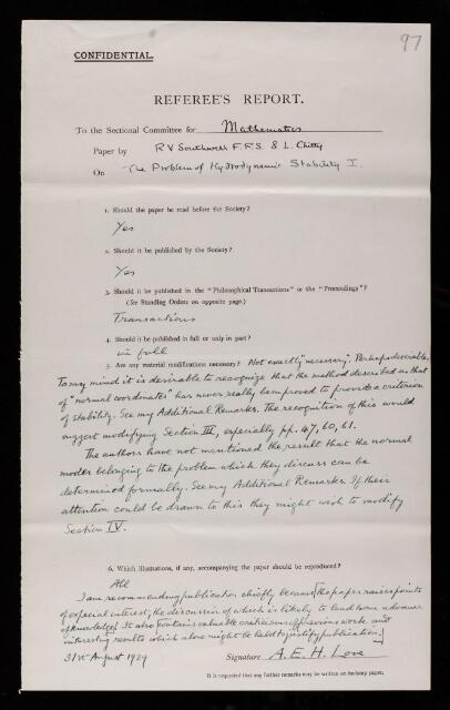 Augustus Edward Hough Love, Referee's report by Augustus Edward Hough Love, on a paper 'On the problem of hydrodynamic stability. I. uniform shearing motion in a viscous fluid' by Richard Vynne Southwell and Letitia Chitty, 31 August 1929, RR/40/97, The Royal Society Archives, London, https://makingscience.royalsociety.org/items/rr_40_97/referees-report-by-augustus-edward-hough-love-on-a-paper-on-the-problem-of-hydrodynamic-stability-i-uniform-shearing-motion-in-a-viscous-fluid-by-richard-vynne-southwell-and-letitia-chitty, accessed on 11 November 2025