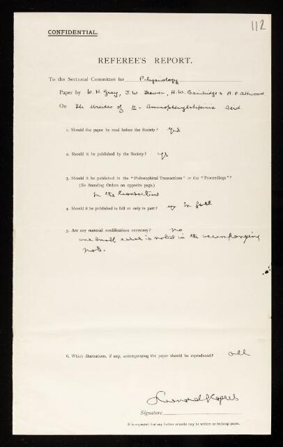 Leonard Rogers, Referee's report by Leonard Rogers, on a paper 'The ureides of p-aminophenylstibinic acid' by W H Gray, John William Trevan, H W Bainbridge and A P Attwood, 14 December 1930, RR/41/112, The Royal Society Archives, London, https://makingscience.royalsociety.org/items/rr_41_112/referees-report-by-leonard-rogers-on-a-paper-the-ureides-of-p-aminophenylstibinic-acid-by-w-h-gray-john-william-trevan-h-w-bainbridge-and-a-p-attwood, accessed on 08 December 2025