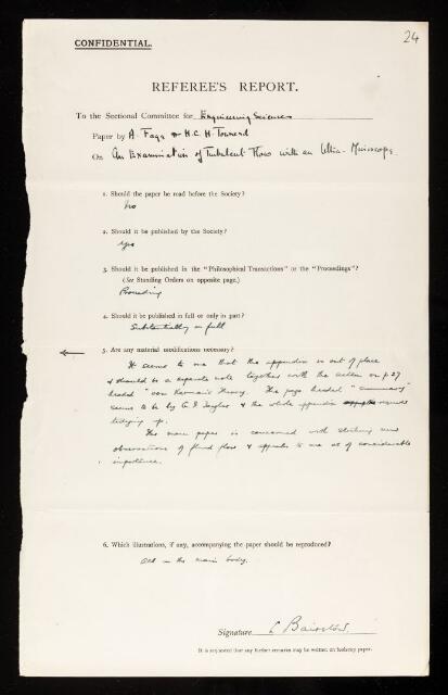 Leonard Bairstow, Referee's report by Leonard Bairstow, on a paper 'An examination of turbulent flow with an ultramicroscope' by Arthur Fage and H C H Townend, January 1932, RR/43/24, The Royal Society Archives, London, https://makingscience.royalsociety.org/items/rr_43_24/referees-report-by-leonard-bairstow-on-a-paper-an-examination-of-turbulent-flow-with-an-ultramicroscope-by-arthur-fage-and-h-c-h-townend, accessed on 12 December 2025