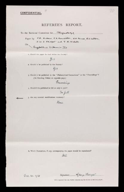 George Barger, Referee's report by George Barger, on a paper 'Crystalline vitamin D' by F A Askew, R B Bourdillon, H M Bruce, Robert Kenneth Callow, J St L Philpot and T A Webster, 10 December 1931, RR/44/20, The Royal Society Archives, London, https://makingscience.royalsociety.org/items/rr_44_20/referees-report-by-george-barger-on-a-paper-crystalline-vitamin-d-by-f-a-askew-r-b-bourdillon-h-m-bruce-robert-kenneth-callow-j-st-l-philpot-and-t-a-webster, accessed on 16 February 2026