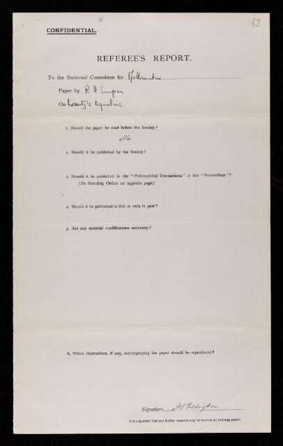 Arthur Stanley Eddington, Referee's report by Arthur Stanley Eddington, on a paper 'Lorentz's equation' by R A Sampson, March 1931, RR/44/62, The Royal Society Archives, London, https://makingscience.royalsociety.org/items/rr_44_62/referees-report-by-arthur-stanley-eddington-on-a-paper-lorentzs-equation-by-r-a-sampson, accessed on 16 November 2025