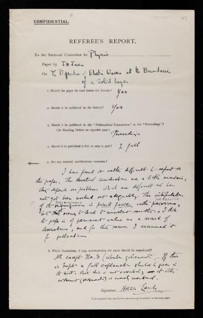 Horace Lamb, Referee's report by Horace Lamb, on a paper 'The diffraction of elastic waves at the boundaries of a solid layer' by J H Jones, April 1932, RR/45/117, The Royal Society Archives, London, https://makingscience.royalsociety.org/items/rr_45_117/referees-report-by-horace-lamb-on-a-paper-the-diffraction-of-elastic-waves-at-the-boundaries-of-a-solid-layer-by-j-h-jones, accessed on 15 February 2026