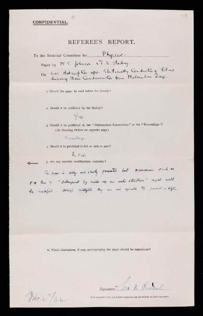 Eric Keightley Rideal, Referee's report by Eric Keightley Rideal, on a paper 'Gas adsorption upon electrically conducting films during their condensation from molecular rays' by R C Johnson and T V Starkey, 22 November 1932, RR/45/119, The Royal Society Archives, London, https://makingscience.royalsociety.org/items/rr_45_119/referees-report-by-eric-keightley-rideal-on-a-paper-gas-adsorption-upon-electrically-conducting-films-during-their-condensation-from-molecular-rays-by-r-c-johnson-and-t-v-starkey, accessed on 12 November 2025