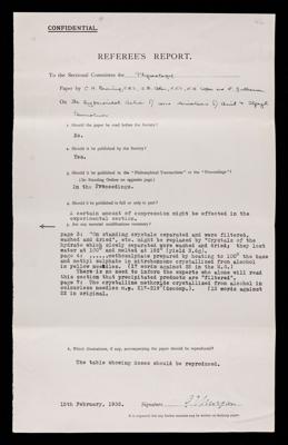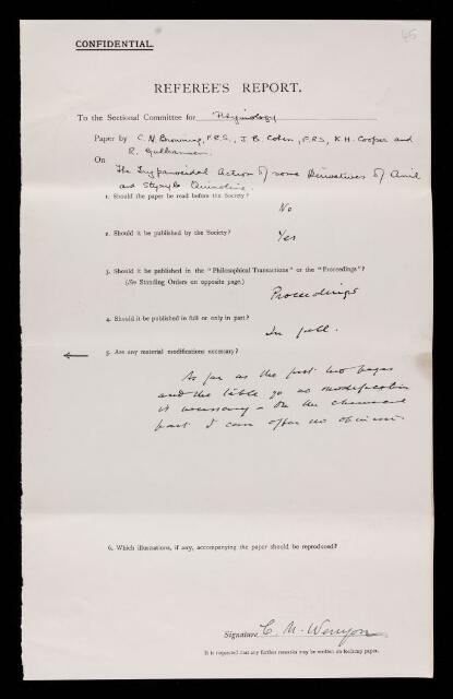 Referee's report by Charles Morley Wenyon, on a paper 'The trypanocidal action of some derivatives of anil and styryl quinolines.—II' by Carl Hamilton Browning, Julius Berend Cohen, K E Cooper and R Gulbransen, February 1932, RR/45/45, The Royal Society Archives, London, https://makingscience.royalsociety.org/items/rr_45_45/referees-report-by-charles-morley-wenyon-on-a-paper-the-trypanocidal-action-of-some-derivatives-of-anil-and-styryl-quinolinesii-by-carl-hamilton-browning-julius-berend-cohen-k-e-cooper-and-r-gulbransen, accessed on 12 February 2026