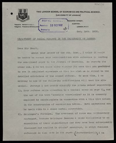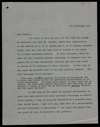 Copy letter from Secretary of the Royal Society [Henry Dale] to Professor L [Lancelot Thomas] Hogben, regarding papers 'The intellectual resemblance of twins' by Louis Herrman and Hogben, and 'The correlation of relatives on the supposition of sex-linked transmission' by Hogben