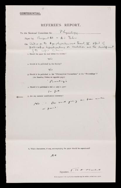 Francis Hugh Adam Marshall, Referee's report by Francis Hugh Adam Marshall, on a paper 'Studies on the hypophysectomised ferret. III. -Effect of post-coitus hypophysectomy on ovulation and the development of the corpus luteum' by Margaret Hill and Alan Sterling Parkes, October 1932, RR/45/79, The Royal Society Archives, London, https://makingscience.royalsociety.org/items/rr_45_79/referees-report-by-francis-hugh-adam-marshall-on-a-paper-studies-on-the-hypophysectomised-ferret-iii-effect-of-post-coitus-hypophysectomy-on-ovulation-and-the-development-of-the-corpus-luteum-by-margaret-hill-and-alan-sterling-parkes, accessed on 08 March 2026