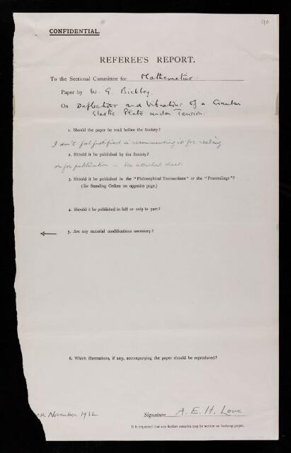 Augustus Edward Hough Love, Referee's report by Augustus Edward Hough Love, on a paper 'On deflections and vibrations of a circular elastic plate under tension' by G W Bickley, 10 November 1932, RR/45/90, The Royal Society Archives, London, https://makingscience.royalsociety.org/items/rr_45_90/referees-report-by-augustus-edward-hough-love-on-a-paper-on-deflections-and-vibrations-of-a-circular-elastic-plate-under-tension-by-g-w-bickley, accessed on 14 November 2025