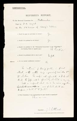 Recommended for publication in the 'Proceedings of the Royal Society of London'. There is still much research to be done, but the paper will 'stimulate the discussion'. Refers to work of Godfrey Harold Hardy and John Edensor Littlewood.