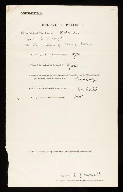 Louis Joel Mordell, Referee's report by Louis Joel Mordell, on a paper 'An extension of Waring's problems' by E Maitland Wright, 10 November 1932, RR/46/120, The Royal Society Archives, London, https://makingscience.royalsociety.org/items/rr_46_120/referees-report-by-louis-joel-mordell-on-a-paper-an-extension-of-warings-problems-by-e-maitland-wright, accessed on 06 December 2025