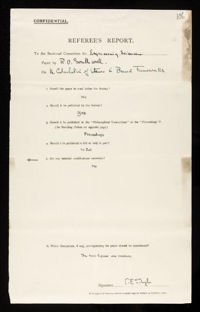 Charles Edward Inglis, Referee's report by Charles Edward Inglis, on a paper 'On the calculation of stresses in braced frameworks' by Richard Vynne Southwell, 10 December 1932, RR/47/108, The Royal Society Archives, London, https://makingscience.royalsociety.org/items/rr_47_108/referees-report-by-charles-edward-inglis-on-a-paper-on-the-calculation-of-stresses-in-braced-frameworks-by-richard-vynne-southwell, accessed on 14 December 2025