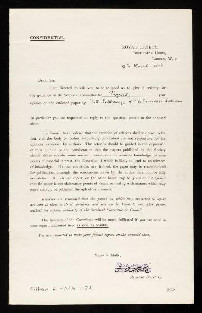 Alfred Fowler, Referee's report by Alfred Fowler, on a paper 'On the hyperfine structure of certain Hg I lines in the electrodeless discharge' by T S Subbaraya and T G Srinivasa Iyengar, 29 March 1932, RR/47/116, The Royal Society Archives, London, https://makingscience.royalsociety.org/items/rr_47_116/referees-report-by-alfred-fowler-on-a-paper-on-the-hyperfine-structure-of-certain-hg-i-lines-in-the-electrodeless-discharge-by-t-s-subbaraya-and-t-g-srinivasa-iyengar, accessed on 17 March 2026