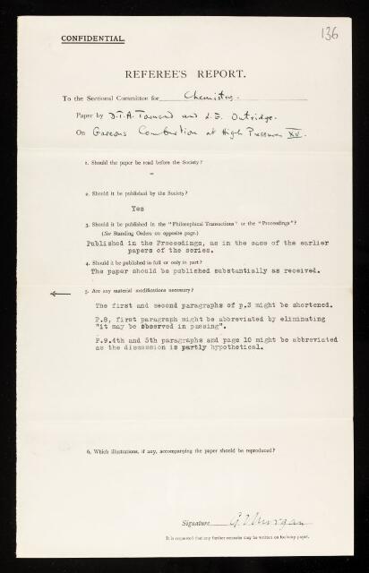 Gilbert Thomas Morgan, Referee's report by Gilbert Thomas Morgan, on a paper 'Gaseous combustion at high pressures. Part XV.— The formation of nitric oxide in carbonic oxide-oxygen-nitrogen explosions' by Donald T A Townend and Lionel E Outridge, October 1932, RR/47/136, The Royal Society Archives, London, https://makingscience.royalsociety.org/items/rr_47_136/referees-report-by-gilbert-thomas-morgan-on-a-paper-gaseous-combustion-at-high-pressures-part-xv-the-formation-of-nitric-oxide-in-carbonic-oxide-oxygen-nitrogen-explosions-by-donald-t-a-townend-and-lionel-e-outridge, accessed on 14 January 2026