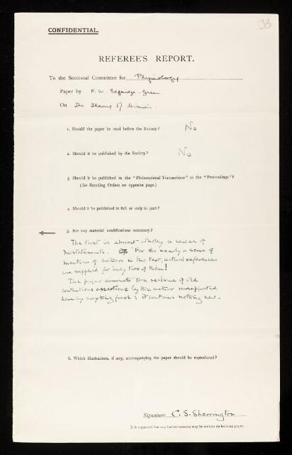 Charles Scott Sherrington, Referee's report by Charles Scott Sherrington, on a paper 'The theory of vision' by F W Edridge-Green, September 1932, RR/47/33, The Royal Society Archives, London, https://makingscience.royalsociety.org/items/rr_47_33/referees-report-by-charles-scott-sherrington-on-a-paper-the-theory-of-vision-by-f-w-edridge-green, accessed on 06 December 2025