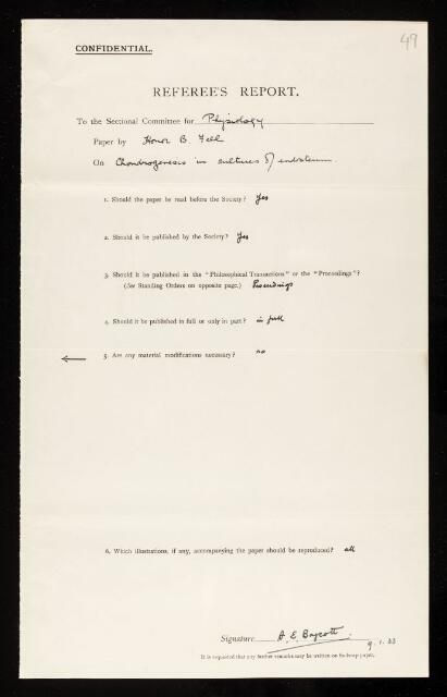 Arthur Edwin Boycott, Referee's report by Arthur Edwin Boycott, on a paper 'Chondrogenesis in cultures of endosteum' by Honor Bridget Fell, 09 January 1933, RR/47/49, The Royal Society Archives, London, https://makingscience.royalsociety.org/items/rr_47_49/referees-report-by-arthur-edwin-boycott-on-a-paper-chondrogenesis-in-cultures-of-endosteum-by-honor-bridget-fell, accessed on 09 February 2026