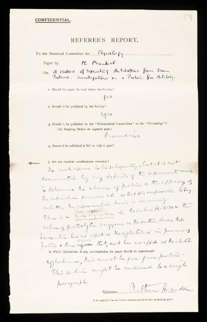 Arthur Harden, Referee's report by Arthur Harden, on a paper 'A method of separating antibodies from serum proteins. Investigations on a protein-free antibody' by Max Frankel, February 1932, RR/47/59, The Royal Society Archives, London, https://makingscience.royalsociety.org/items/rr_47_59/referees-report-by-arthur-harden-on-a-paper-a-method-of-separating-antibodies-from-serum-proteins-investigations-on-a-protein-free-antibody-by-max-frankel, accessed on 06 December 2025