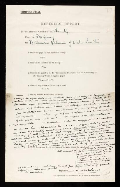 Cyril Norman Hinshelwood, Referee's report by Cyril Norman Hinshelwood, on a paper 'The quantum mechanics of electrochemistry. II' by R W Gurney, January 1932, RR/47/77, The Royal Society Archives, London, https://makingscience.royalsociety.org/items/rr_47_77/referees-report-by-cyril-norman-hinshelwood-on-a-paper-the-quantum-mechanics-of-electrochemistry-ii-by-r-w-gurney, accessed on 08 February 2026